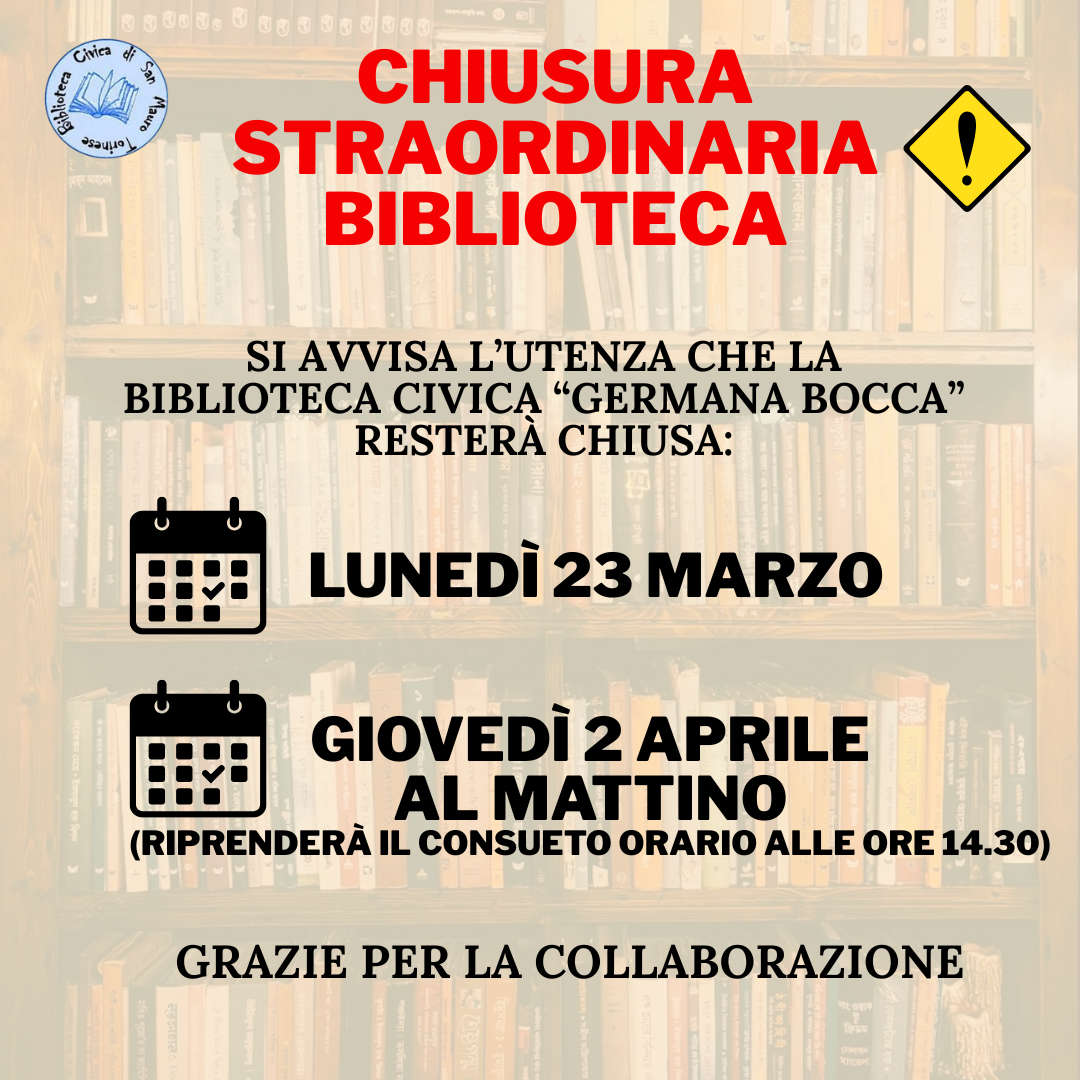 Si informa che la Biblioteca Civica “Germana Bocca” resterà chiusa per chiusura straordinaria nelle seguenti giornate: